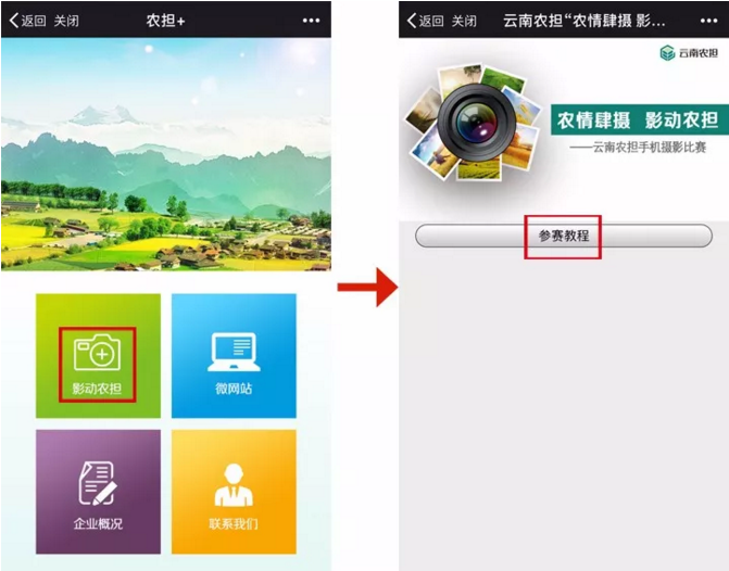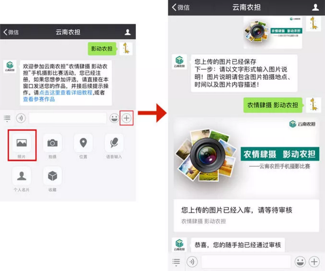參與方式二:關(guān)注“云南農(nóng)擔”官方微信號,點擊“農(nóng)擔+”欄目,選擇“影動農(nóng)擔”進入,查看教程后,完成信息錄入,在對話框內(nèi)發(fā)送1張圖片及一句話描述即可。
