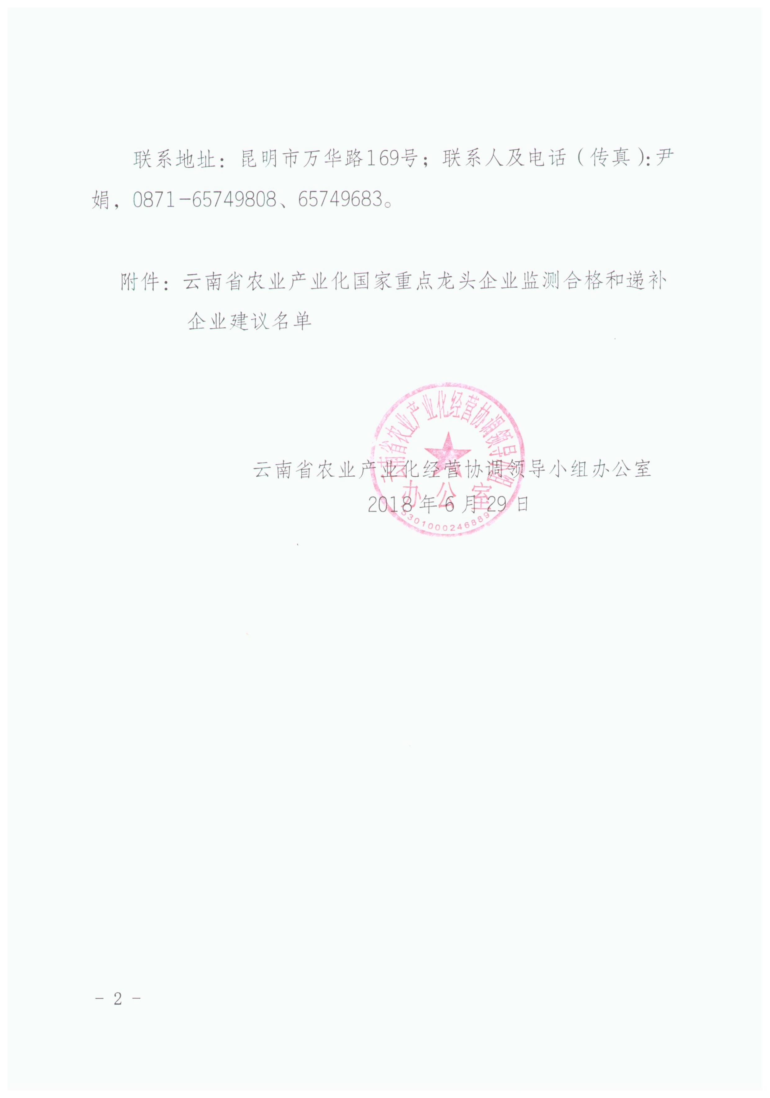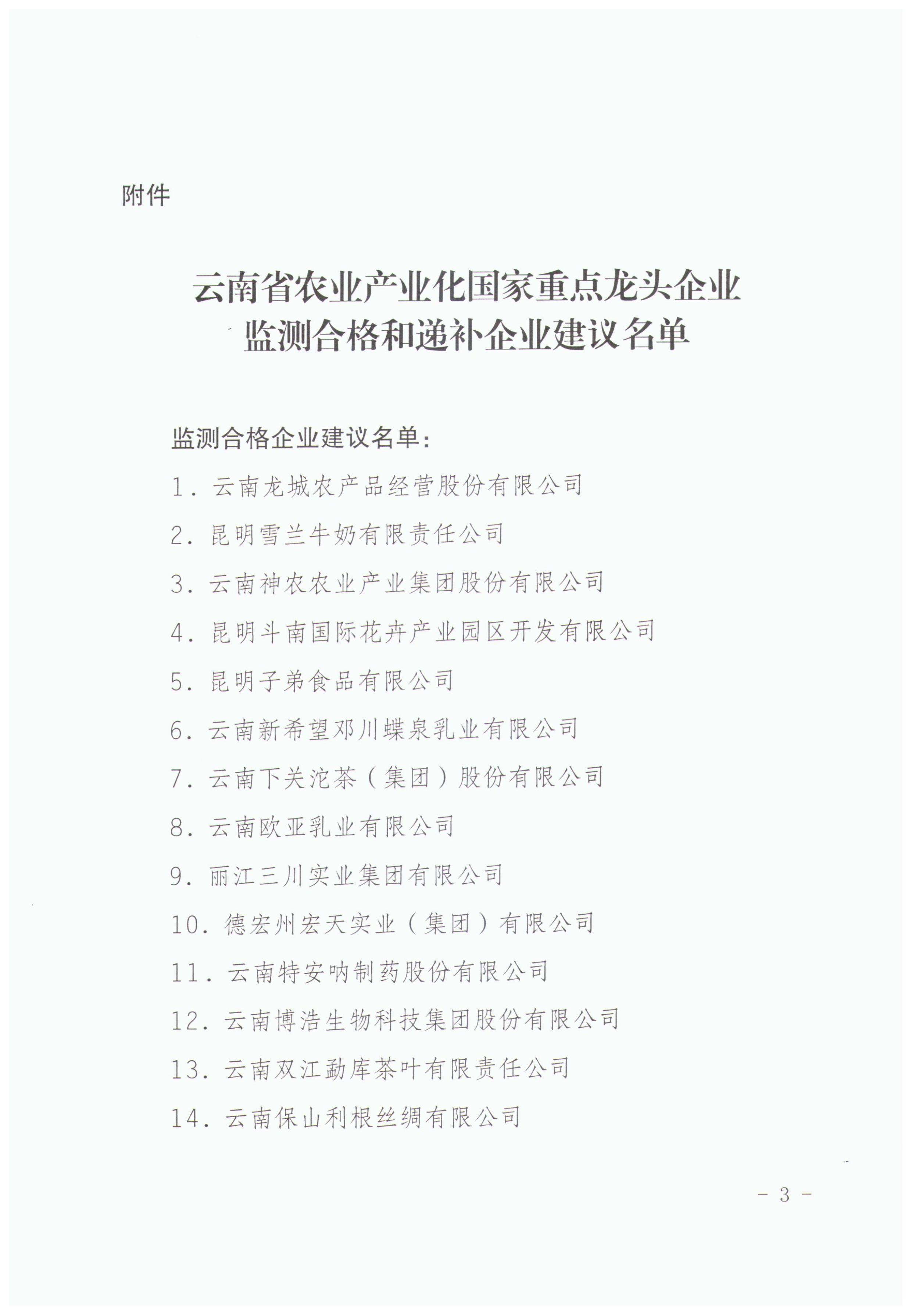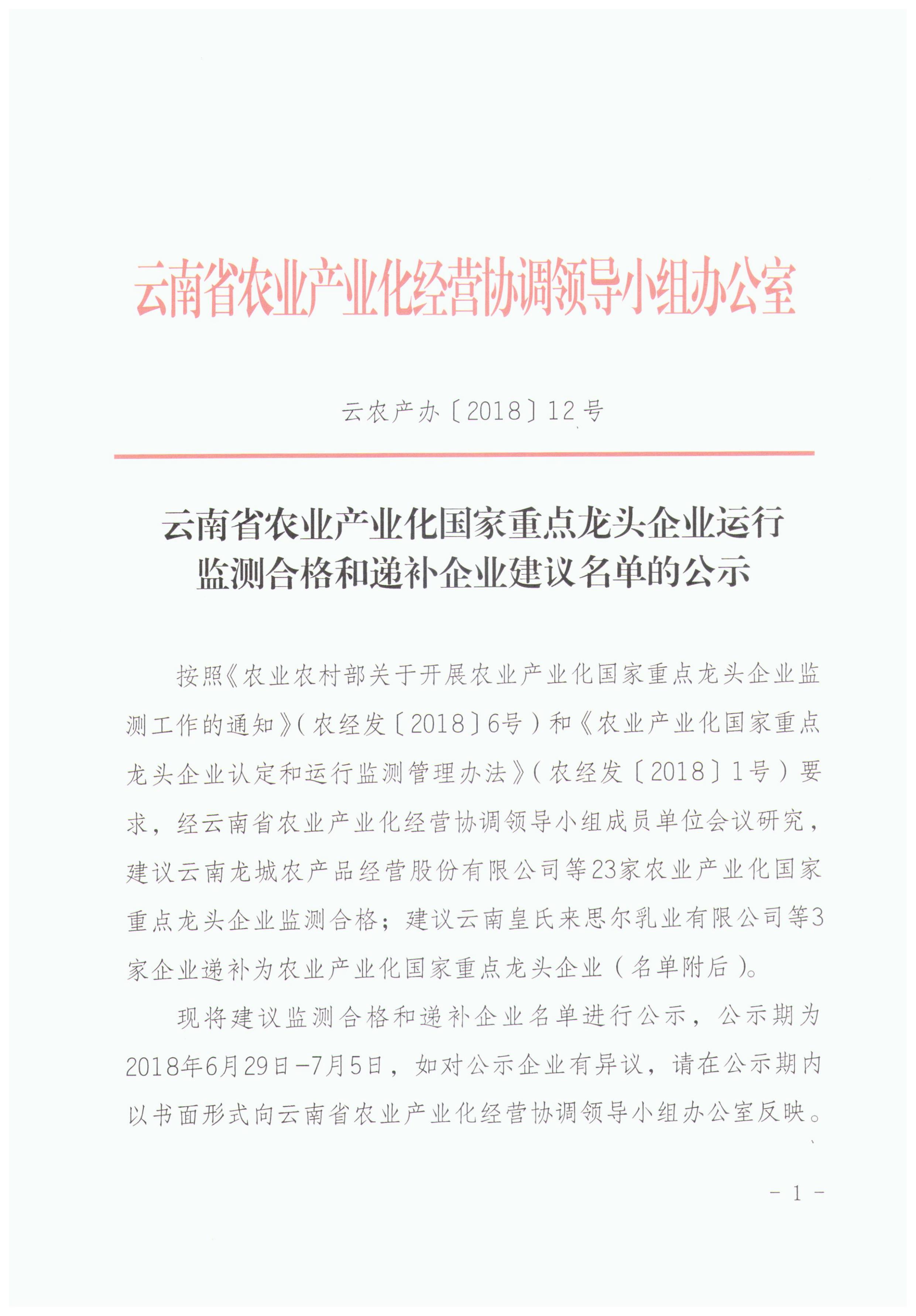 云南省農(nóng)業(yè)產(chǎn)業(yè)化國家重點(diǎn)龍頭企業(yè)運(yùn)行監(jiān)測合格和遞補(bǔ)企業(yè)建議名單的公示